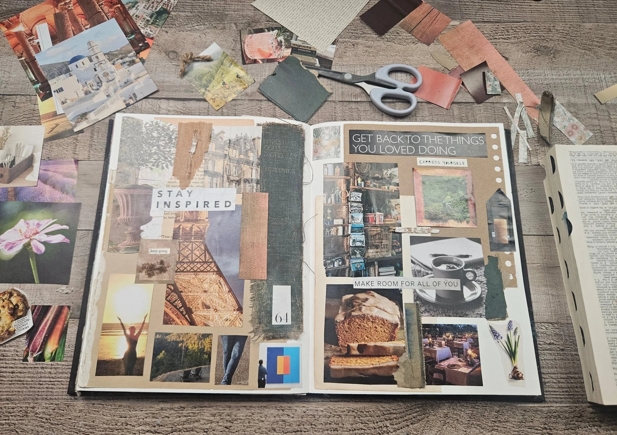 At the beginning of January, I was stuck, unable to begin making art. I find this often happens when I step away for a week or so. In an attempt to do something, anything, I decided to make an art journal version of a mood or inspiration board. Keeping it simple, I cut out magazine images of things I love. This is an easy, low-bar type of creative fun with no right or wrong. You don’t need all the answers or any answers. Just a magazine, scissors, and glue.