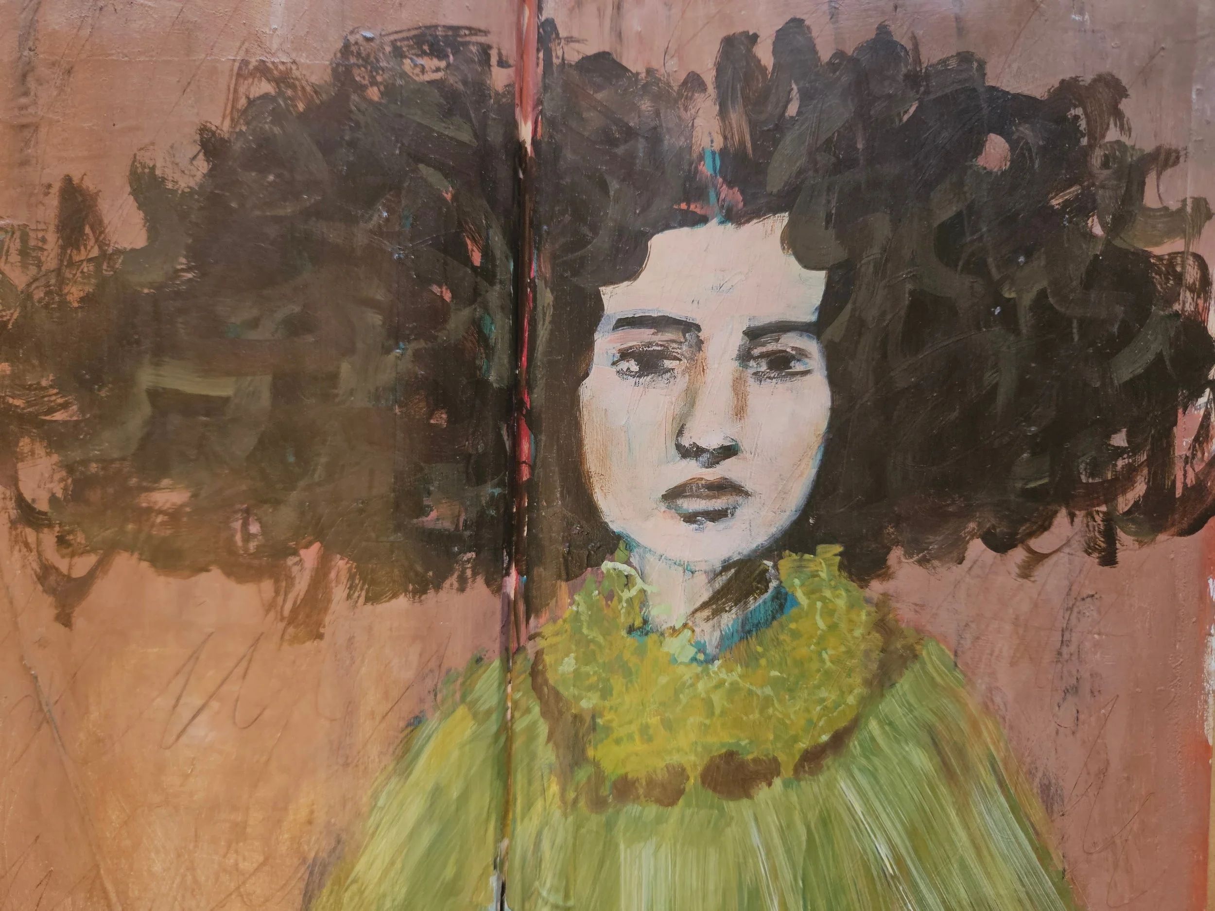 My interpretation of her silkscreen artwork, titled “New Orleans,” is shown here. I gave myself an hour, painted on top of collage, and across two pages in my art journal, which immediately ensured it was different from hers. I quickly realized my mistake in deciding to paint wider than the original; the composition became too heavy on the right side. Copying an artist’s work as a study, even in your own style, is a powerful tool for learning. It is one I would highly recommend.